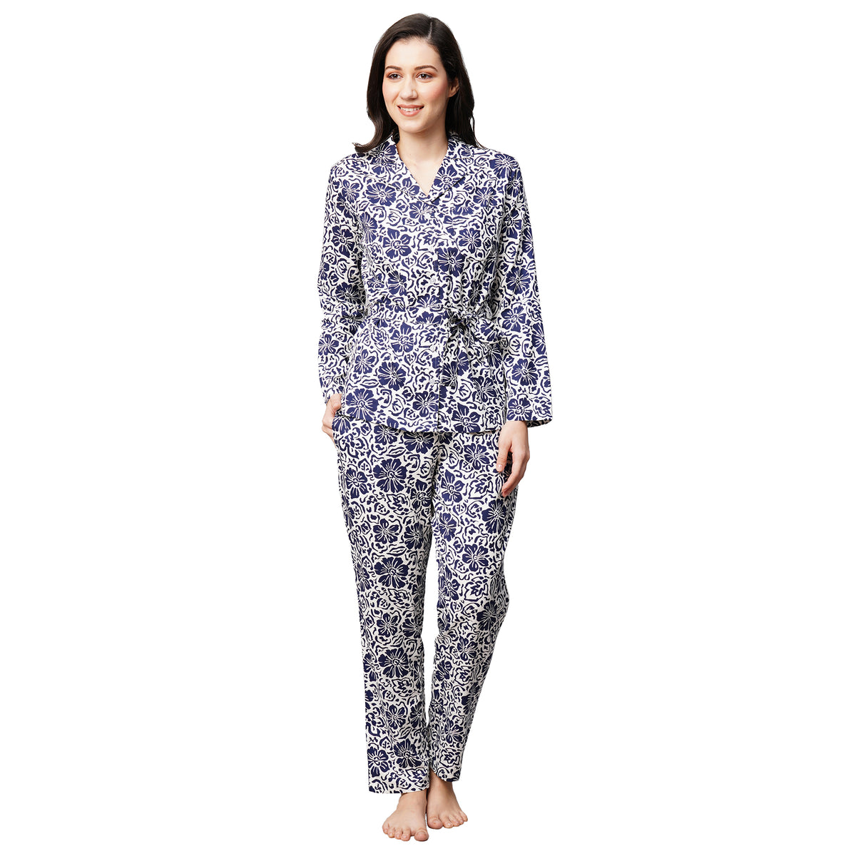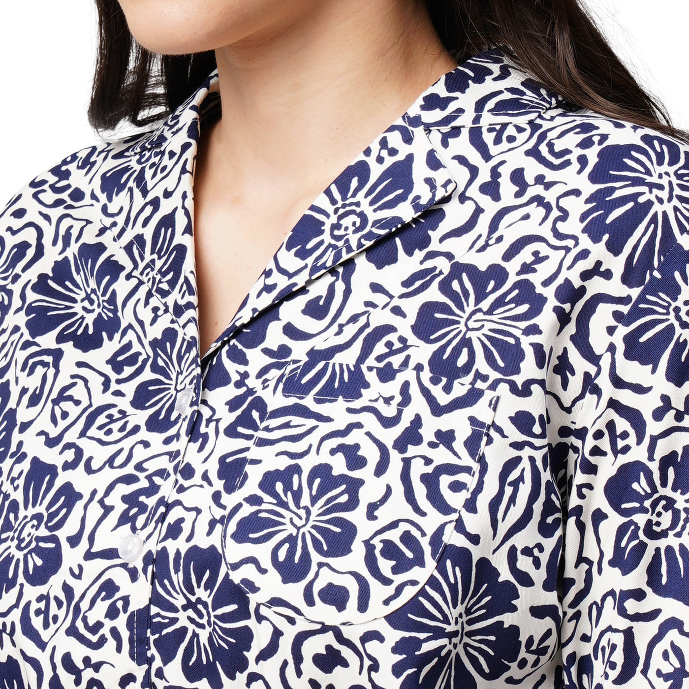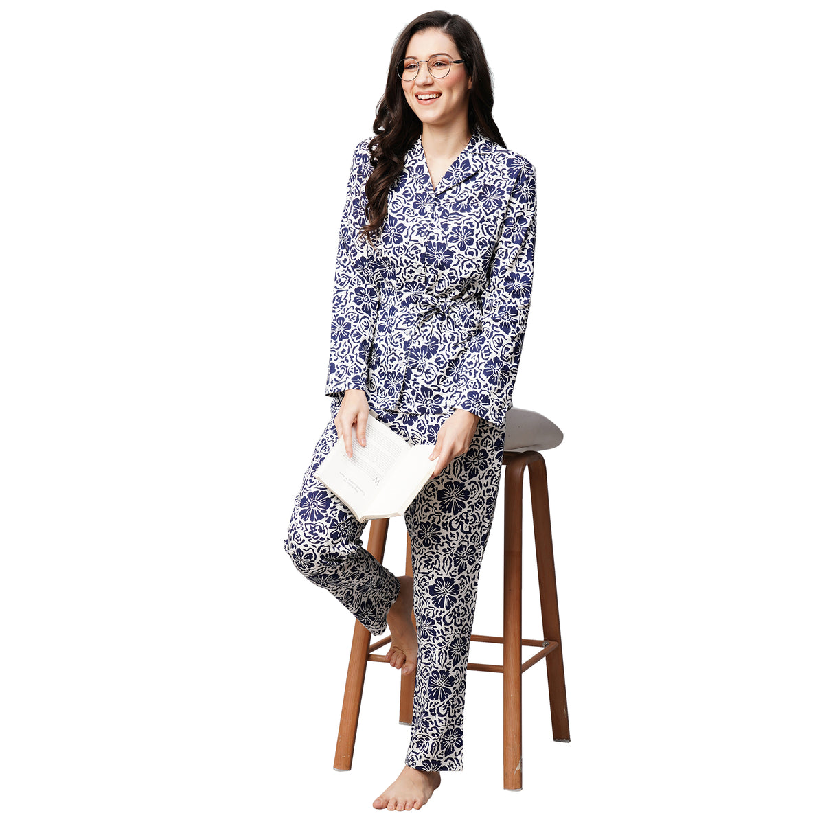 Drape In Vogue Womens White With Navy Blue Flower Print Night Suit