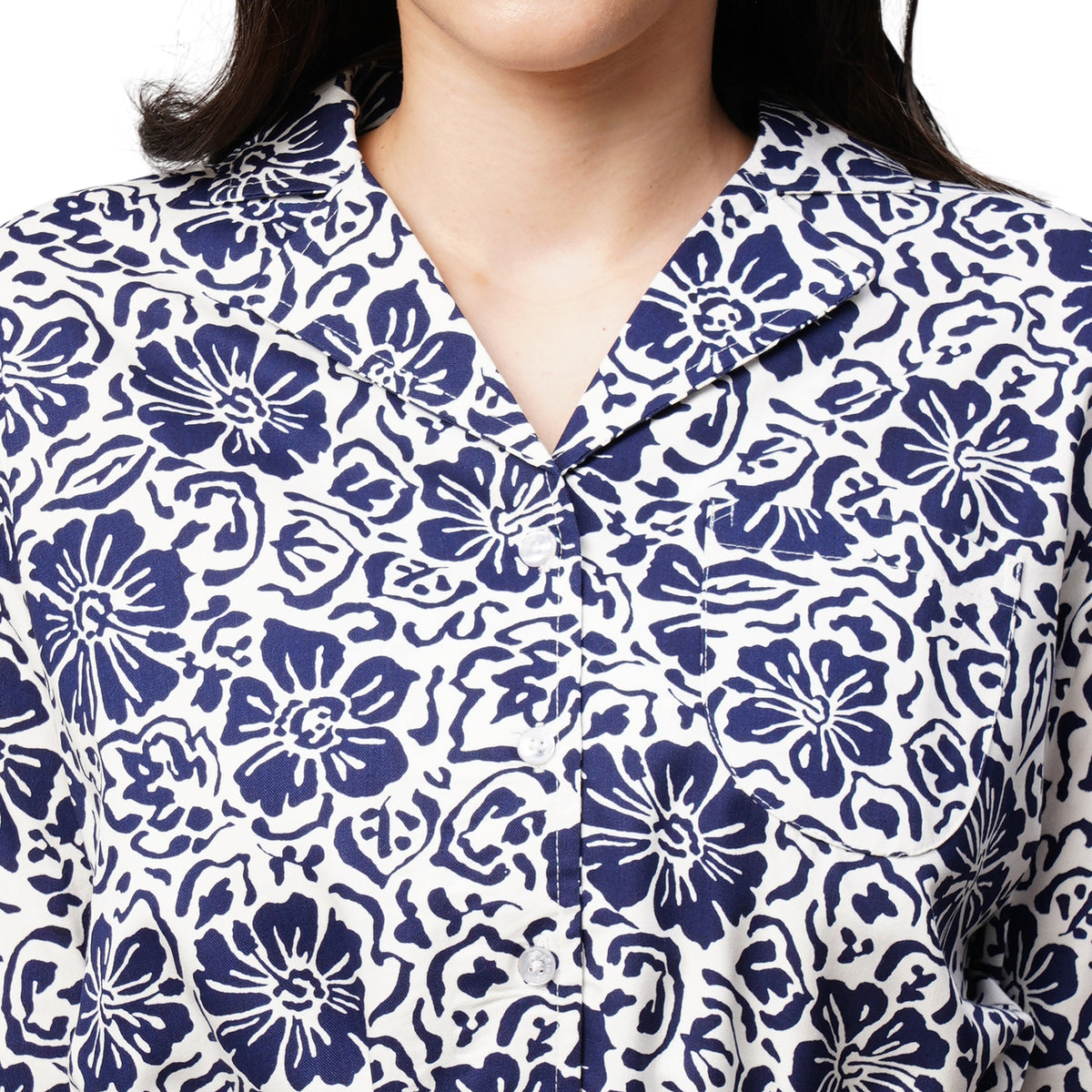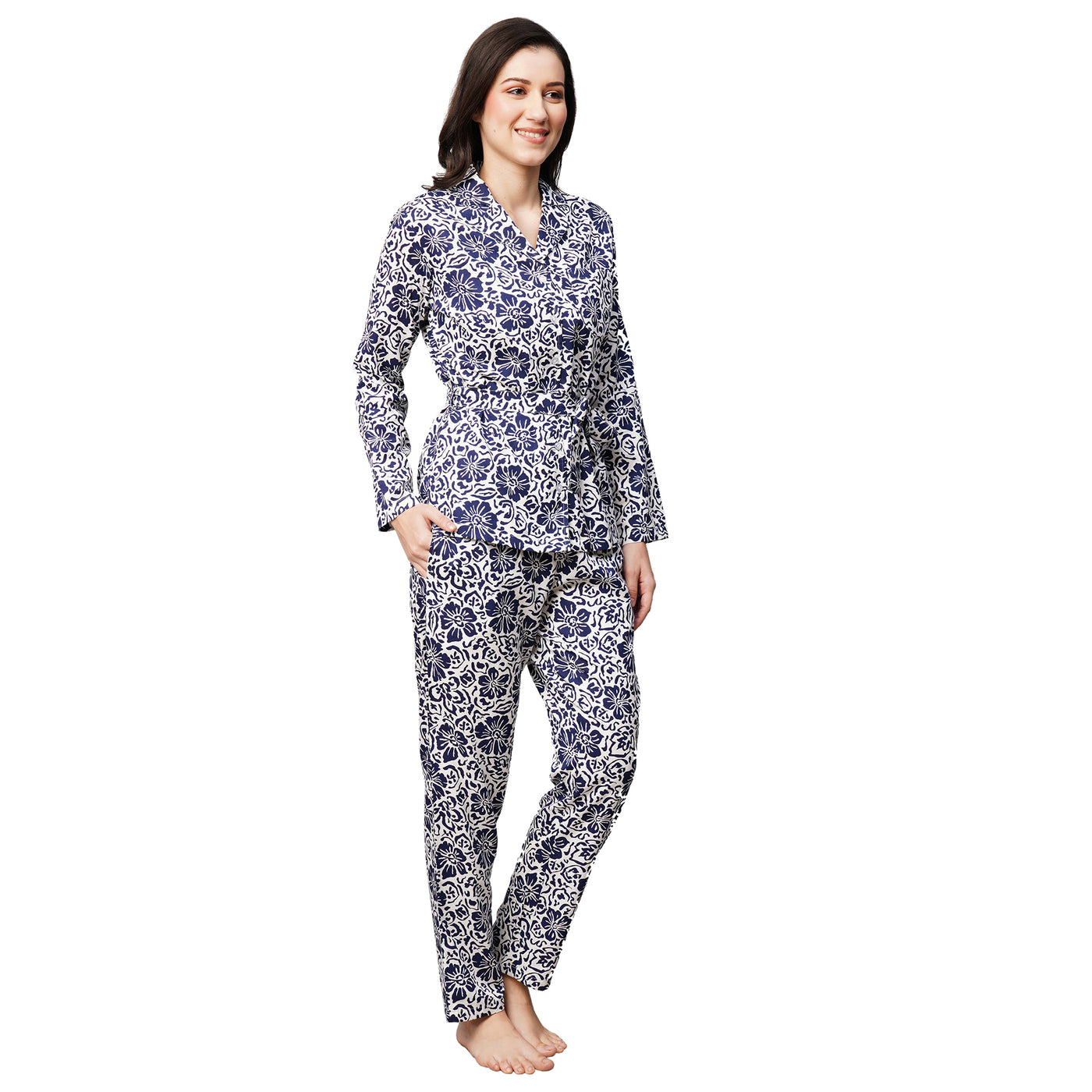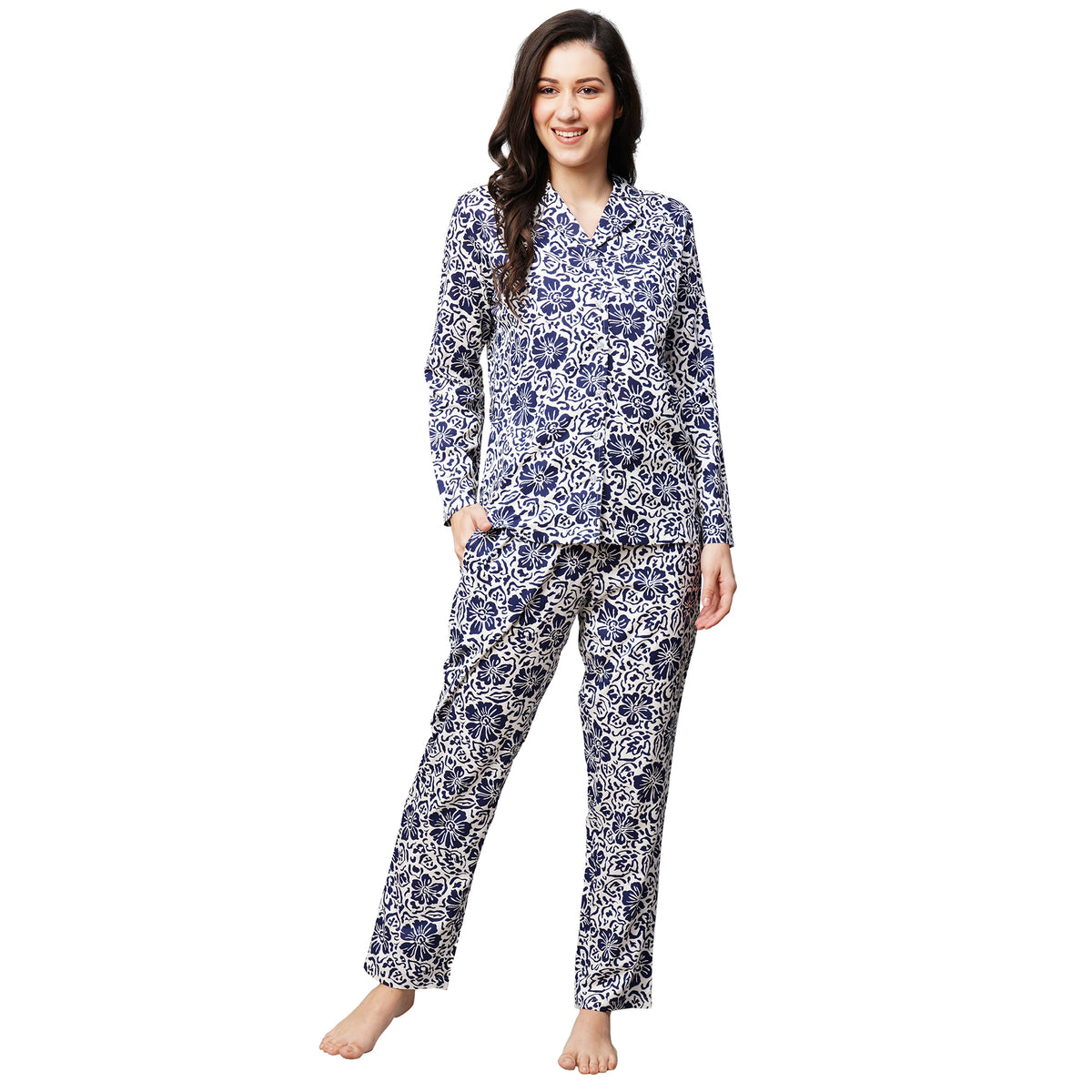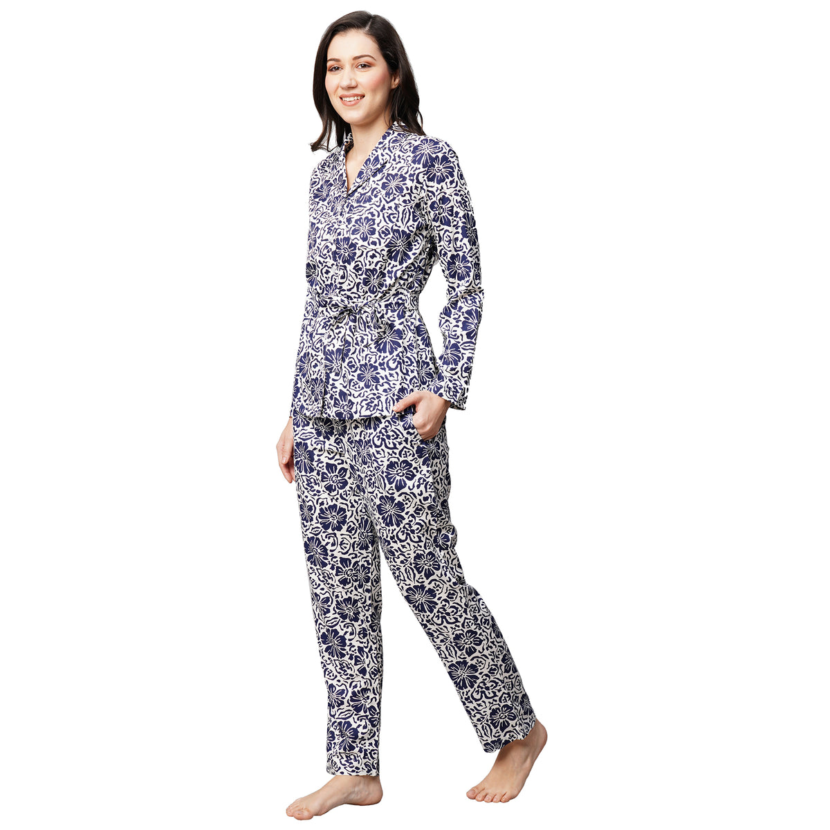 Drape In Vogue Womens White With Navy Blue Flower Print Night Suit
